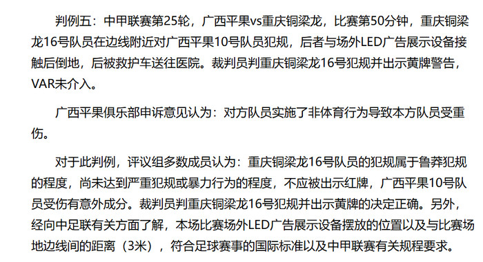 此外,对于广西平果俱乐部申诉的第60分钟可能点球判罚,评议组一致认为重庆铜梁龙防守队员先触到球,随后接触到对方队员,无犯规动作,不构成犯规。