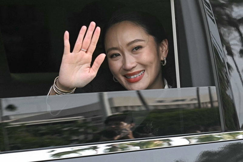 8月29日,泰国曼谷,佩通坦向车外挥手致意的画面。