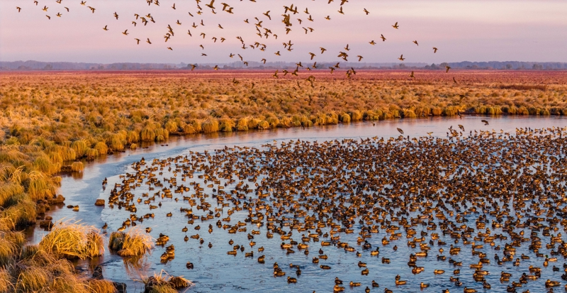 10月22日,黑龙江挠力河国家级自然保护区,候鸟在晨光中翔集。\n 新华社 盛景利 摄