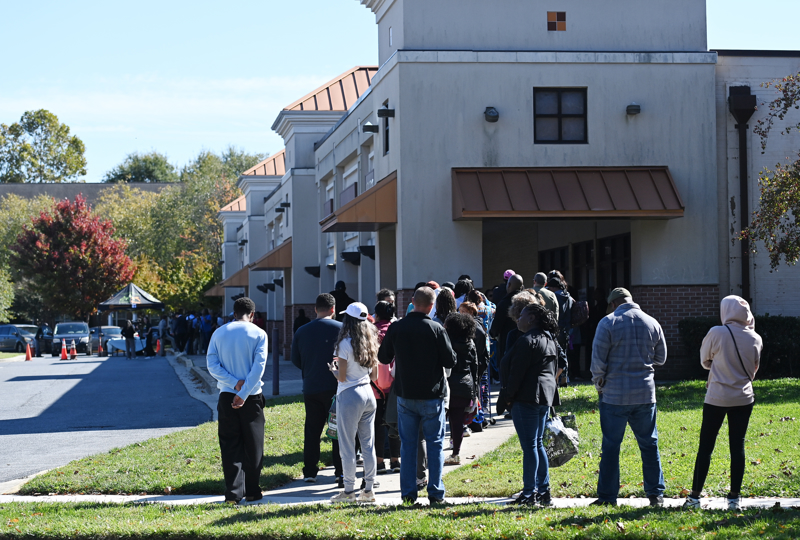 10月21日,美国马里兰州海厄茨维尔市,联邦雇员排队领取免费食品。\n 新华社 李睿 摄