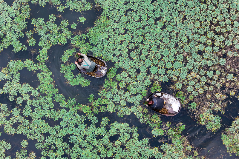 10月22日,浙江省湖州市吴兴区东林镇泉心村村民划着菱桶采摘菱角。\n 新华社 何伟卫 摄