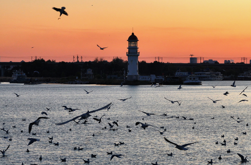 10月21日,候鸟在松花江哈尔滨段翔集。\n 新华社 张树 摄