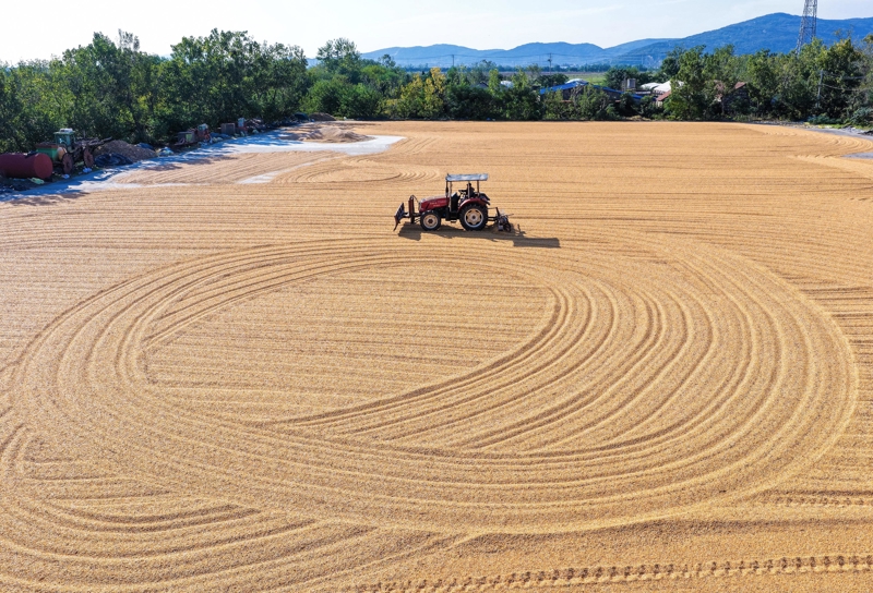 10月22日,农民在江苏省连云港市云台农场十一生产区晾晒玉米。\n 新华社 王健民 摄