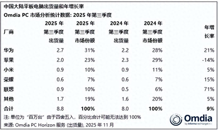 今天分享的是2025年Q3国内平板电脑出货量榜单,该季度总出货量为880万台,同比增长仅为9%。除了苹果以外股票配资平台最新,国产厂商都有不同程度的提升,其中最出彩的是华为和联想。在榜单排名方面,小米排名第三,苹果排名第二,华为这次真的是继续遥遥领先。